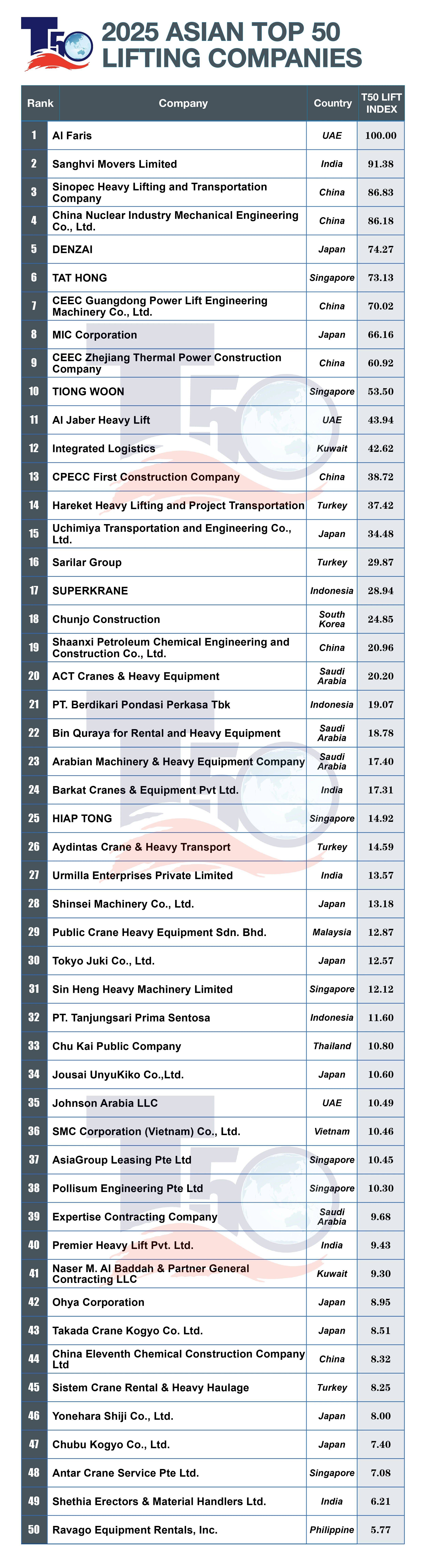 2025年10月消息:全球工程机械制造商50强峰会亚洲论坛发布了“2025亚洲吊装50强”。这是首份亚洲吊装行业榜单,从经营质量、管理能力、安全、工程业绩、品牌形象和商誉度等多个维度进行综合评定。